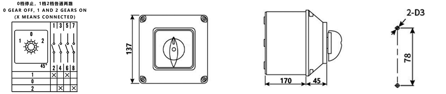 El SZW26-125 D202.2BF es un interruptor de cambio giratorio de alta resistencia con una corriente nominal de hasta 125 A. Cuenta con una estructura de tres posiciones (1-0-2) y dos posiciones (dos secciones), completamente encapsulada en una carcasa con clasificación IP65. Diseñado para conmutación de doble ruta y aislamiento seguro de circuitos de corriente ultraalta, su lógica de contacto es clara: la posición "1" conecta el primer conjunto de contactos (1-2, 5-6); la posición "2" conecta el segundo conjunto de contactos (3-4, 7-8); la posición intermedia "0" garantiza que todos los contactos estén completamente desconectados Proporcionar un punto de aislamiento eléctrico claro y seguro. Es adecuado para circuitos AC 440V/50-60Hz y DC 240V, con una tensión de aislamiento nominal de 660V. Internamente, utiliza conductores de cobre engrosados de gran sección y contactos de aleación de plata, lo que garantiza una baja resistencia de contacto, una alta capacidad de transporte de corriente y resistencia al arco a 125 A. Sus tornillos de cableado de tamaño M6 pueden conectar cables de sección transversal grande de 35 a 50 mm², cumpliendo con los requisitos de conexión confiables bajo alta densidad de corriente. La carcasa protectora IP65 evita por completo la intrusión de polvo y la pulverización de agua a baja presión, con una vida mecánica ≥100.000 ciclos y una vida eléctrica ≥30.000 ciclos.