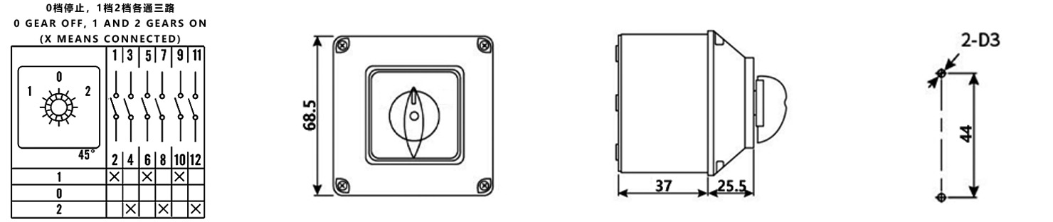 En la posición "1", el interruptor conecta el primer grupo de cinco contactos (1-2, 5-6, 9-10, 13-14, 17-18); en la posición "2", conecta el segundo grupo de cinco contactos (3-4, 7-8, 11-12, 15-16, 19-20); la posición media "0" garantiza que todos los contactos estén completamente desconectados proporcionando un punto crucial de aislamiento de seguridad. El producto cuenta con una carcasa ignífuga y resistente a altas temperaturas, con conductores de cobre engrosados y contactos de aleación de plata en su interior, lo que garantiza una conductividad confiable a largo plazo con una corriente de 20 A. Su carcasa protectora sellada IP65 puede soportar inmersión completa y pulverización de agua a baja presión desde cualquier dirección. La vida mecánica no es inferior a 100.000 ciclos y la vida eléctrica no es inferior a 30.000 ciclos.