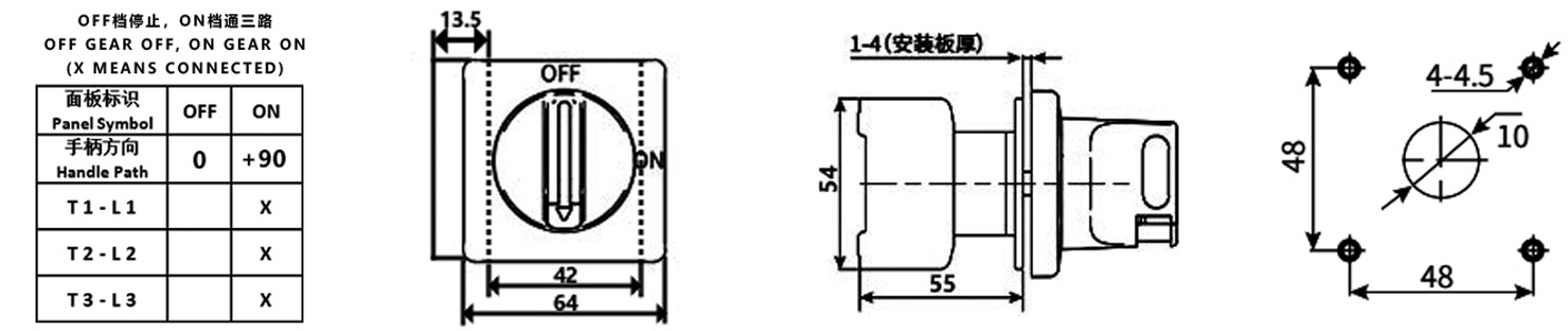 Número de polos y función: Tripolar (3P). Operación de dos posiciones (ON/OFF) del mango: