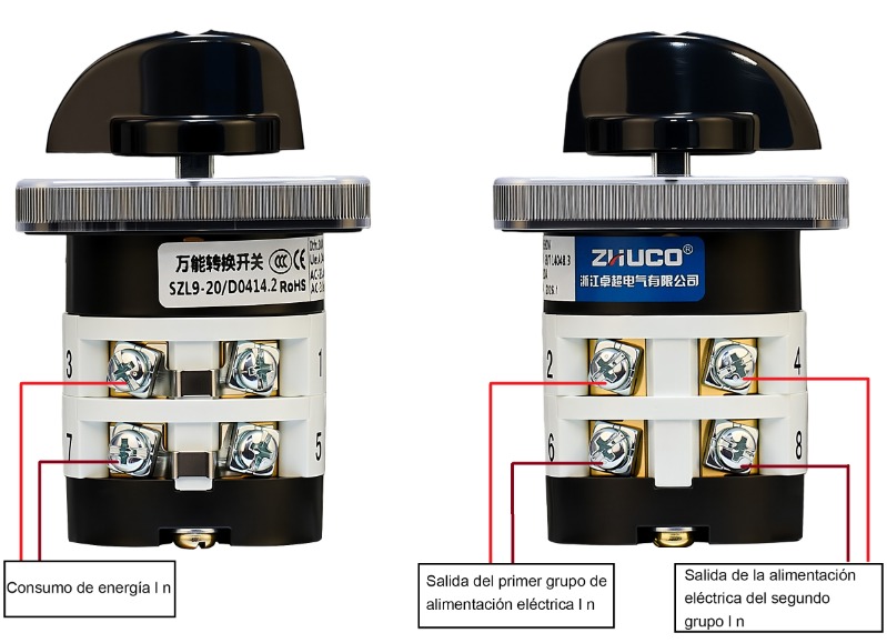 Función: Divide una entrada de energía en dos salidas de energía para cambiar entre dos dispositivos. Cuando se gira el mango a la posición 1, se energiza el primer circuito LN; en la posición 2, se energiza el segundo circuito LN; en la posición central O, se desenergizan todos los circuitos.