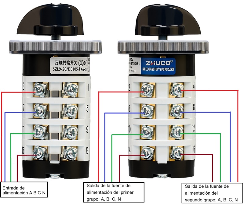 Función: Divide una entrada de energía en dos salidas de energía para cambiar entre dos dispositivos. Cuando se gira el mango a la posición 1, se energiza el primer grupo ABCN; en la posición 2, se energiza el segundo grupo ABCN; en la posición central 0, se desenergizan todas las conexiones.
