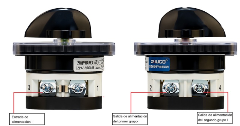 Función: Divide una entrada de energía en dos salidas de energía para cambiar entre dos dispositivos. Cuando se gira el mango a la posición 1, se energiza el primer grupo L; en la posición 2, se energiza el segundo grupo L; en la posición central 0, se desenergizan todas las conexiones.