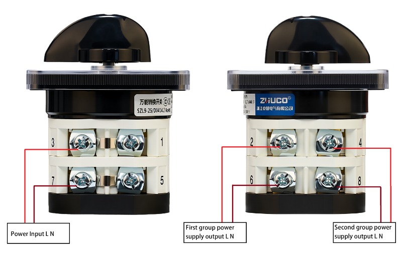 Función: Divide una entrada de energía en dos salidas de energía para cambiar entre dos dispositivos. Cuando se gira el mango a la posición 1, se energiza el primer circuito LN; en la posición 2, se energiza el segundo circuito LN; en la posición central 0, se desenergizan todos los circuitos.