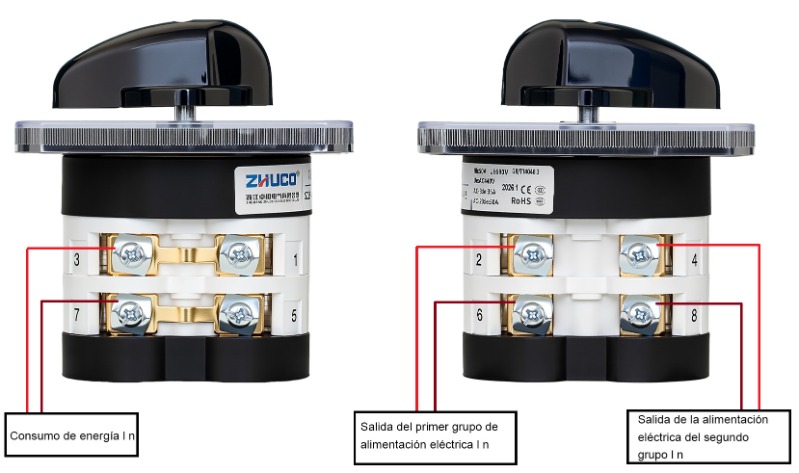 Función: Divide una entrada de energía en dos salidas de energía para cambiar entre dos dispositivos. Cuando se gira el mango a la posición 1, se energiza el primer circuito LN; en la posición 2, se energiza el segundo circuito LN; en la posición central 0, se desenergizan todos los circuitos.