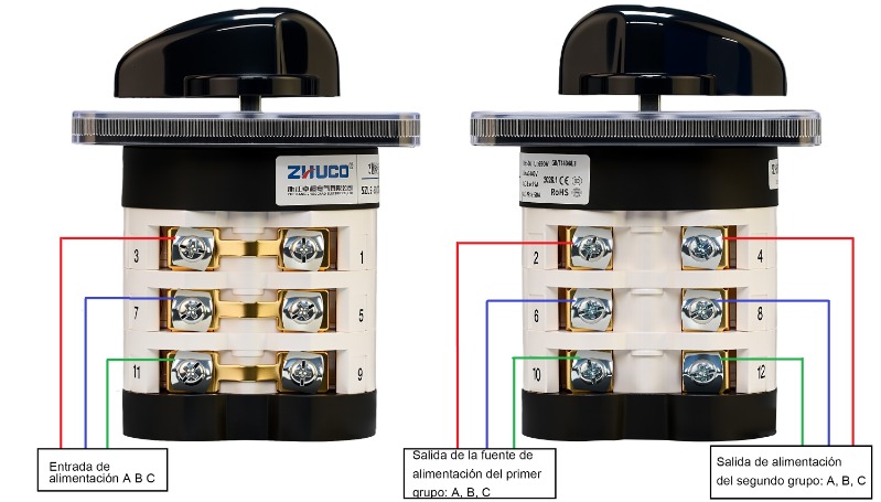 Función: Divide una entrada de energía en dos salidas de energía para cambiar entre dos dispositivos. Cuando se gira el mango a la posición 1, se energiza el primer conjunto de conexiones ABC; en la posición 2, se energiza el segundo conjunto de conexiones ABC; en la posición central 0, se desenergizan todas las conexiones.